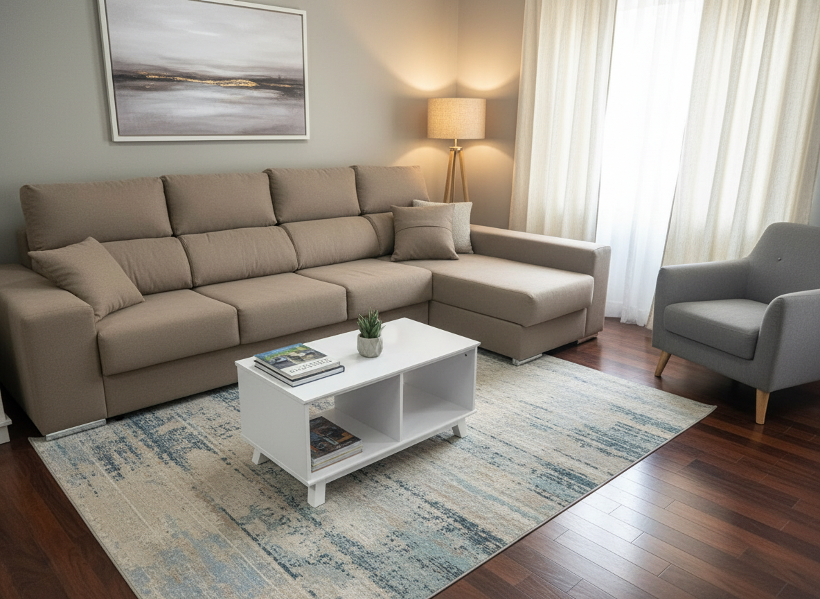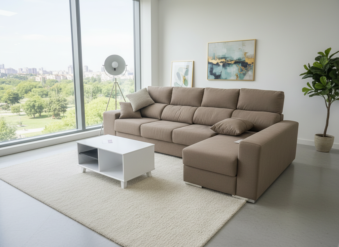 El sofá "Covadonga" combina versatilidad, comodidad y diseño moderno. Su estructura de líneas rectas y su tapizado en marrón claro, que le da un aspecto cálido y acogedor y fácil de integrar en diferentes estilos de decoración.