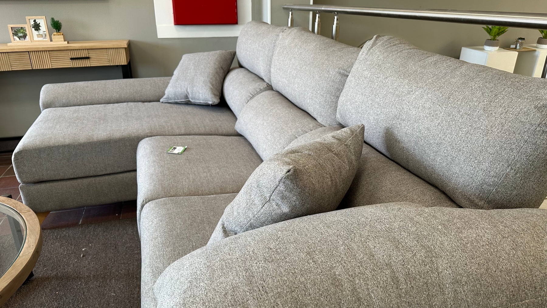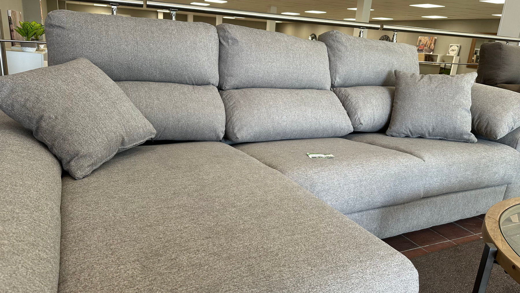 Cuenta con una chaise longue en el lado izquierdo, ideal para estirarse y disfrutar de momentos de descanso. Incluye  dos cojines decorativos y dos cojines laterales que realzan su comodidad y estilo. Las patas elevan ligeramente el sofá, aportando ligereza visual y un contraste cálido con el tono del tapizado.