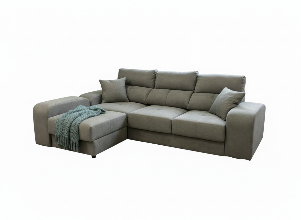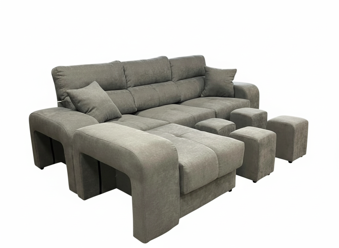 La chaise longue en el lado derecho permite extender las piernas y relajarse, mientras que los brazos anchos aportan un toque de robustez y elegancia. Además, incluye dos cojines decorativos y un puff a juego, ideal como reposapiés o asiento adicional.