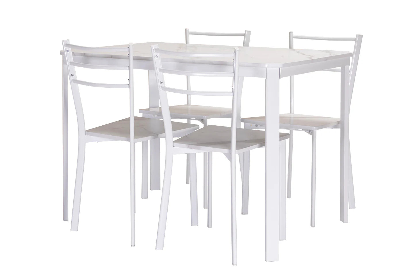 Conjunto de Mesa y 4 Sillas, Efecto Marmol Blanco y Metal. Comedor o Cocina
